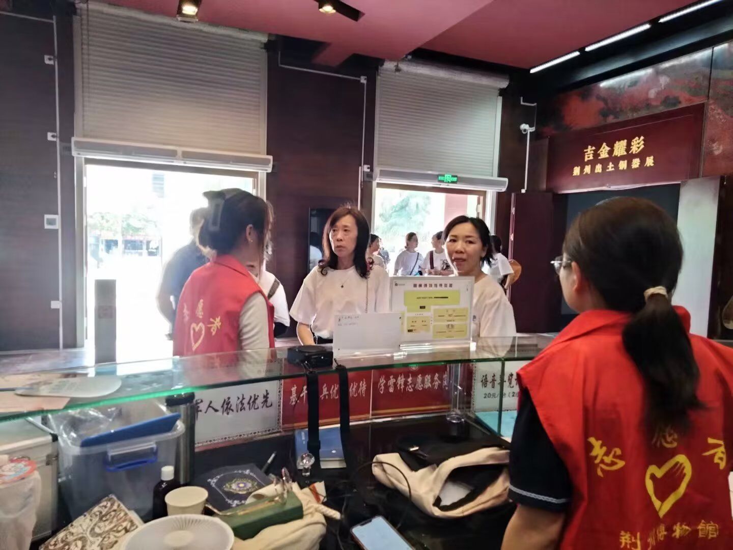 志愿者们到达博物馆,在耐心听完博物馆负责人对志愿任务的分配后,积极投身到自己的工作中。即使在炎炎夏日,她们也非常耐心地为游客们答疑解惑,为游客提供一个良好的参观体验。