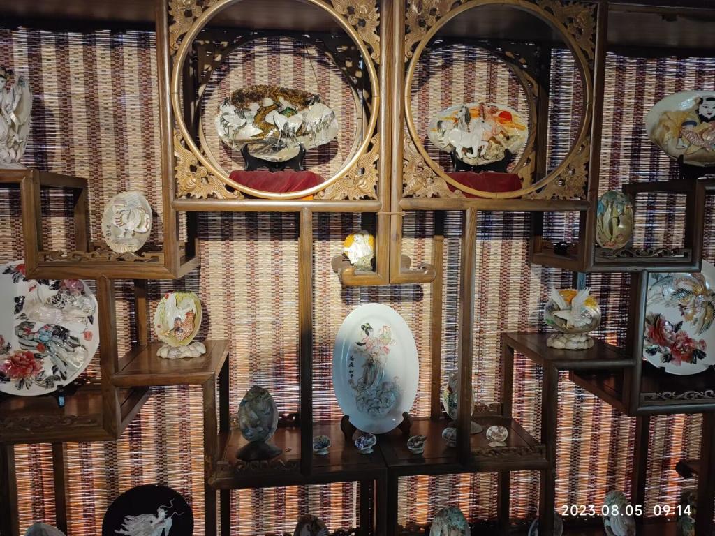 首先映入眼帘的是淡水贝雕——以荆楚盛产的三角机蚌贝、褶纹冠蚌贝、背瘤丽蚌贝为主要原料,经过设计、选料、切割、打磨、上色、抛光、堆砌、粘贴等十多道手工工艺流程精雕细琢,形成平贴、半浮雕、镶嵌、立体等多种形式和规格的工艺品。淡水贝雕作品,色彩绚丽,光泽柔腻,晶莹光华,尽显贝壳丰润细腻、色泽绚丽的质感魅力和荆楚大地的自然风光及人文美景,呈现出是海的绮丽与传统文化智慧的结晶,具有贝壳的自然美、雕塑的技法美和国画的格调美,十分令人惊叹。