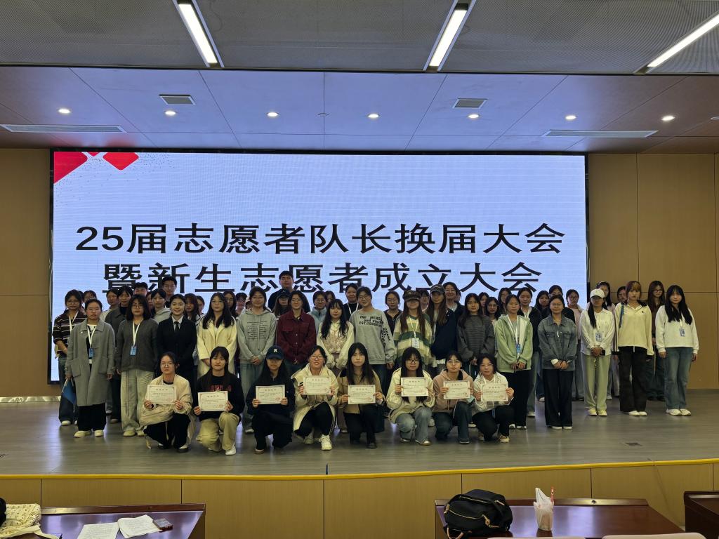 议程伊始,24届志愿者队长杨宇轩分享志愿活动社会价值、指明未来方向;25届队长谭云秋结合实践,阐述志愿活动双向成长的意义。志愿者代表孟星彤诠释“奉献、友爱、互助、进步”信念,带领全体志愿者庄严宣读宣言。 随后,24届青工部部长杨飞燕、25届部长李胡懿先后复盘工作、分享心得,提出优化方案助力志愿工作提质增效。现场播放的服务队活动视频,生动展现了志愿者们忙碌鲜活的服务瞬间,传递着温暖力量。表彰环节,辅导员许静婷为优秀志愿者颁奖,肯定其志愿精神并勉励大家携手前行。大会最后,全体参会人员合影留念,定格这份凝聚热爱与责任的珍贵时刻。