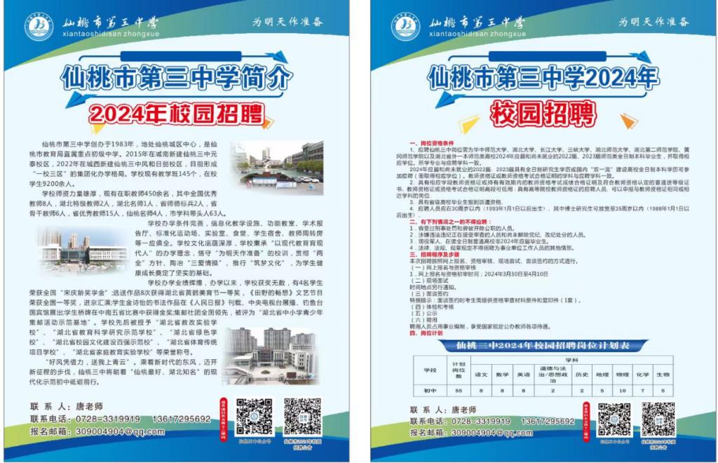 仙桃市第三中学创办于1983年,地处仙桃城区中心,是仙桃市教育局直属重点初级中学。2015年在城南新建仙桃三中元泰校区,2022年在城西新建仙桃三中风和日丽校区,目前形成“一校三区”的集团化办学格局。公司现有教学班145个,在校员工9200余人。