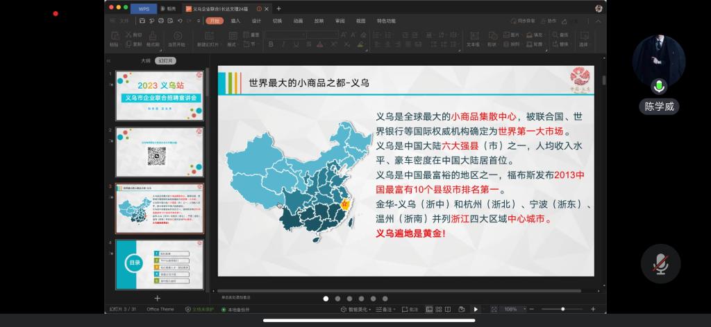 12月25日上午,广州广创科技有限公司罗老师从教育人才招聘、职业技能培训、教育信息等方面展开讲解。12月29日上午,丝路互连电商创业园有限公司付银银结合实际案例,围绕企业文化、经营理念、运营项目、工作环境为同学们做了全面介绍。义乌温投集团陈学威通过围绕集团文化、岗位需求、薪资福利等方面进行讲解,并通过云端与员工交流互动,解疑答惑。