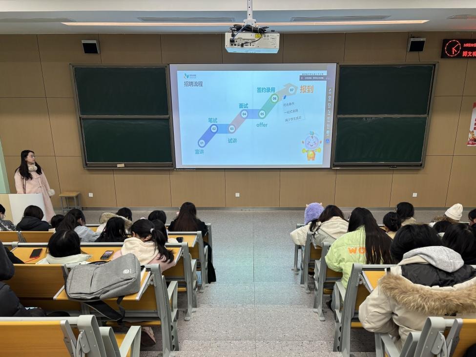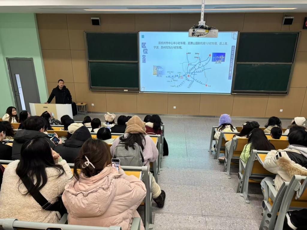 临安园区人才服务中心的刘总深入介绍杭州市临安区外贸跨境人才引进情况,涵盖园区区位交通优势、电缆电线产业、装饰纸产业等特色产业,以及当地历史人文与产业平台建设成果。同时展示校企合作成功案例,阐述外贸业务员岗位招聘所要求的专业技能与综合素养。义乌市知见企业管理咨询有限公司的陈总从“我们是谁”“为何选择义乌”“我们的人才需求与岗位详情”“联合关于我们”以及“如何加入我们”五个维度全面深入的讲解义乌电商,为毕业生们呈现了义乌电商领域广阔的发展前景与机遇。思考乐宣讲环节,叶老师介绍集团团队力量,相关招聘信息以及文化活动与社会福利。上海合橙网络公司郑老师介绍公司项目、企业概况与岗位。