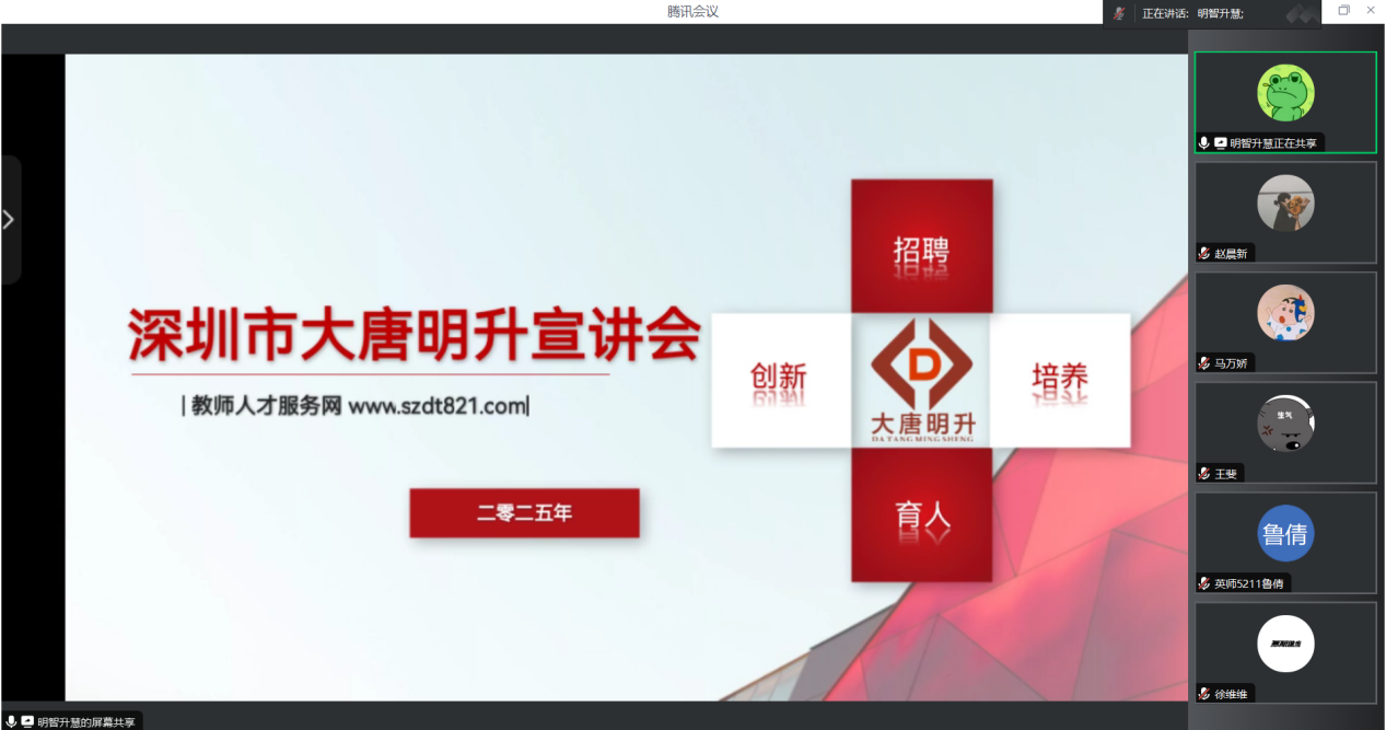 本网讯(通讯员 赵晨新)2025年4月14日晚7时,一场聚焦教育实习岗位的线上宣讲会圆满举行。本次宣讲会由bw必威西汉姆联官方网站精心主办,深圳市大唐明升教育集团作为招聘方,为广大怀揣教育梦想的学子带来了高中英语顶岗实习的宝贵机会,吸引了众多员工踊跃参与。