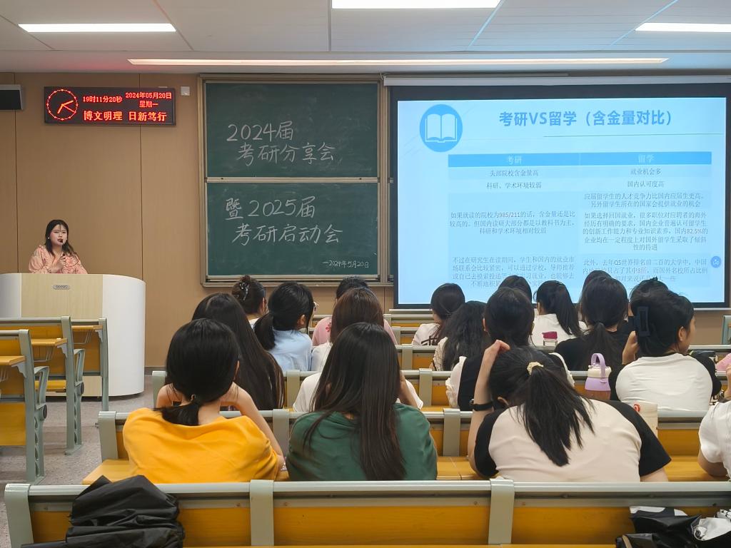 首先,钟燚老师与同学们一齐表达对艾维佳的热烈欢迎。随后,艾维佳在时间、上岸难度,学制及含金量四个方面对比国内考研与出国留学的性价比,其目的在于引导同学们选择适合自己的方向。再次,艾维佳分享了她自身考研及申请国外研究生的经历,旨在帮助2025届考研同学理清考研思路。最后,她提出“双线并行”的建议,鼓励考研同学在参加国内考研的同时,也准备材料申请国外研究生,这不仅能大幅度提高同学们的英语水平,也能给同学们的考研之路上双层保险。