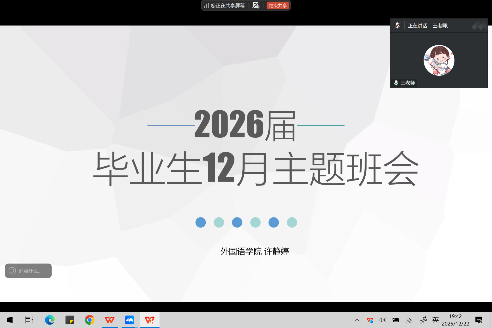 本网讯(通讯员 许静婷)为帮助 2026 届毕业生准确把握当前就业形势,熟悉毕业流程与就业手续,12 月 22 日晚,bw必威西汉姆联官方网站通过腾讯会议线上平台召开了 2026 届毕业生就业指导主题班会。外国语公司党总支书记王玲玲、辅导员许静婷、毕业班班主任们及 2026 届全体毕业生参加了本次会议。