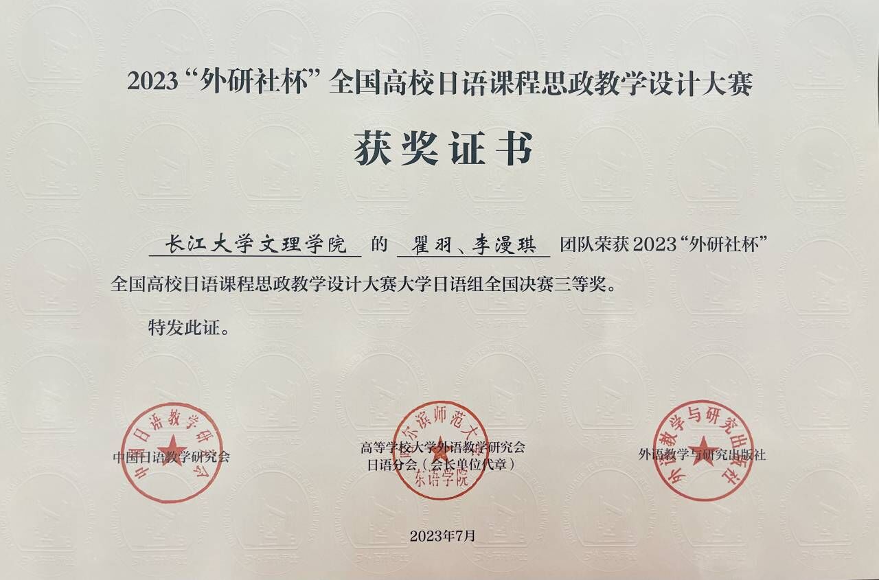 本网讯 7月28日,从bw必威西汉姆联官方网站传来捷报:在刚刚落幕的2023年“外研社”全国高校日语学科课程思政教学设计大赛(大学日语组)中,该院教师瞿羽、李漫琪团队荣获本届大赛全国决赛三等奖。