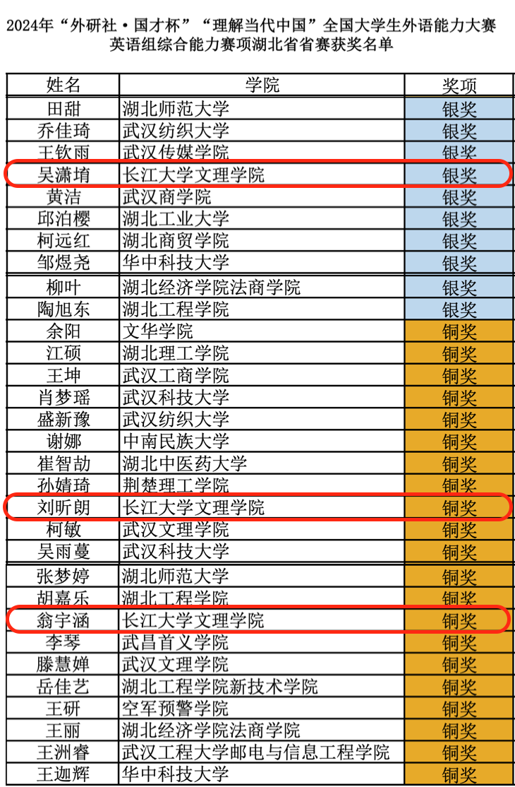 本网讯 近日,2024“外研社·国才杯”“理解当代中国”全国老员工外语能力大赛英语组综合能力赛项湖北省省赛获奖名单新鲜出炉。公司员工英师5231班吴潇堉获银奖,商务5221班刘昕朗以及商务5231班翁宇涵均获铜奖,英师5222班胡荣、英日5221班胡文馨以及商务S5241班赵书华获优胜奖。本次参赛选手的指导教师为罗丹和许娴静。