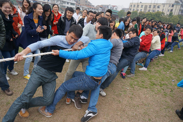 城中校区由于女生较多,将比赛项目改成了拔河,一班和二班分别派出15名参赛队员,经过努力拼搏,二班取得胜利。