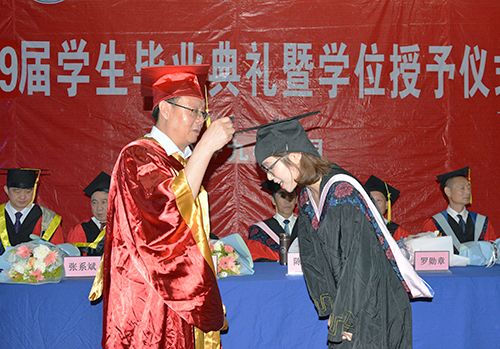 在庄严的气氛中,梅平为毕业生代表正冠拨穗、颁发学位证书。