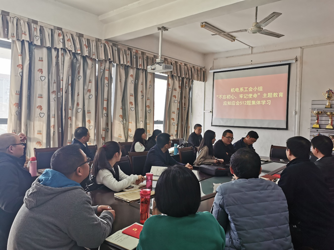 (通讯员 熊守丽)11月21日,机电系工会小组组织理论学习活动,集中学习“不忘初心、牢记使命”主题教育应知应会512题的内容。机电系全体教职工认真参加学习,加强学习的针对性和指导性,系统地梳理了主题教育重点知识,包括党的十九大精神、党章党规党纪知识等,认真领会习近平新时代中国特色社会主义思想,牢牢把握“守初心、担使命,找差距、抓落实”的总要求,坚持学懂弄通做实,锤炼思想品格,贯彻落实到教学、科研、管理的各个方面。