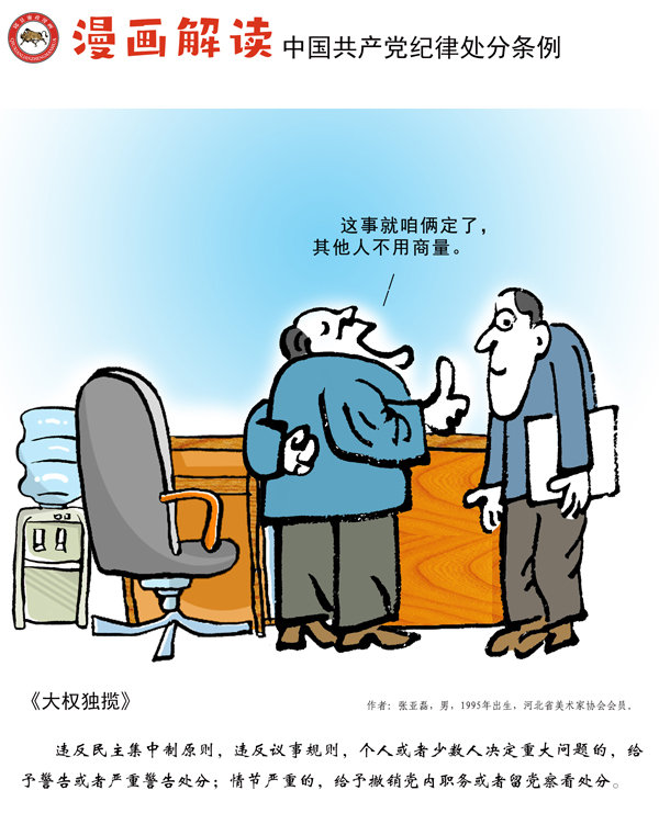 编者按:纪律是我们党的生命线,加强纪律建设是全面从严治党的治本之策。为深入贯彻落实十九届中央纪委四次全会关于加强党纪国法教育的部署要求,强化党规党纪的学习宣传、贯彻执行,使铁的纪律真正转化为党员干部的日常习惯和自觉遵循,中央纪委国家监委网站联合河北省纪委监委,以漫画形式对《中国共产党纪律处分条例》进行解读,陆续连载刊发,敬请关注。