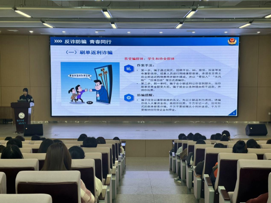 随后,御路口派出所民警周警官从实际案例出发,围绕员工群体常见的“兼职刷单、冒充客服、虚假购物、虚假贷款、游戏交易”等骗局对电信网络诈骗进行了详细讲解,并指出电信网络诈骗的手段翻新速度快,侵害范围广,强调同学们在遇到陌生来电和不法信息时一定要保持警惕,不轻信、不转账、不上当,更不能随意透露个人隐私、银行卡账户密码等敏感信息。周警官还细致分析了受害者上当受骗的原因,揭示其侥幸心理以警示各位初入社会的员工,同时向大家分享各种防范对策及被骗后的补救措施,做到先保障自身权益少受损害,再尽快掌握对方的有罪证据迅速报警,对犯罪现象做出有效打击。