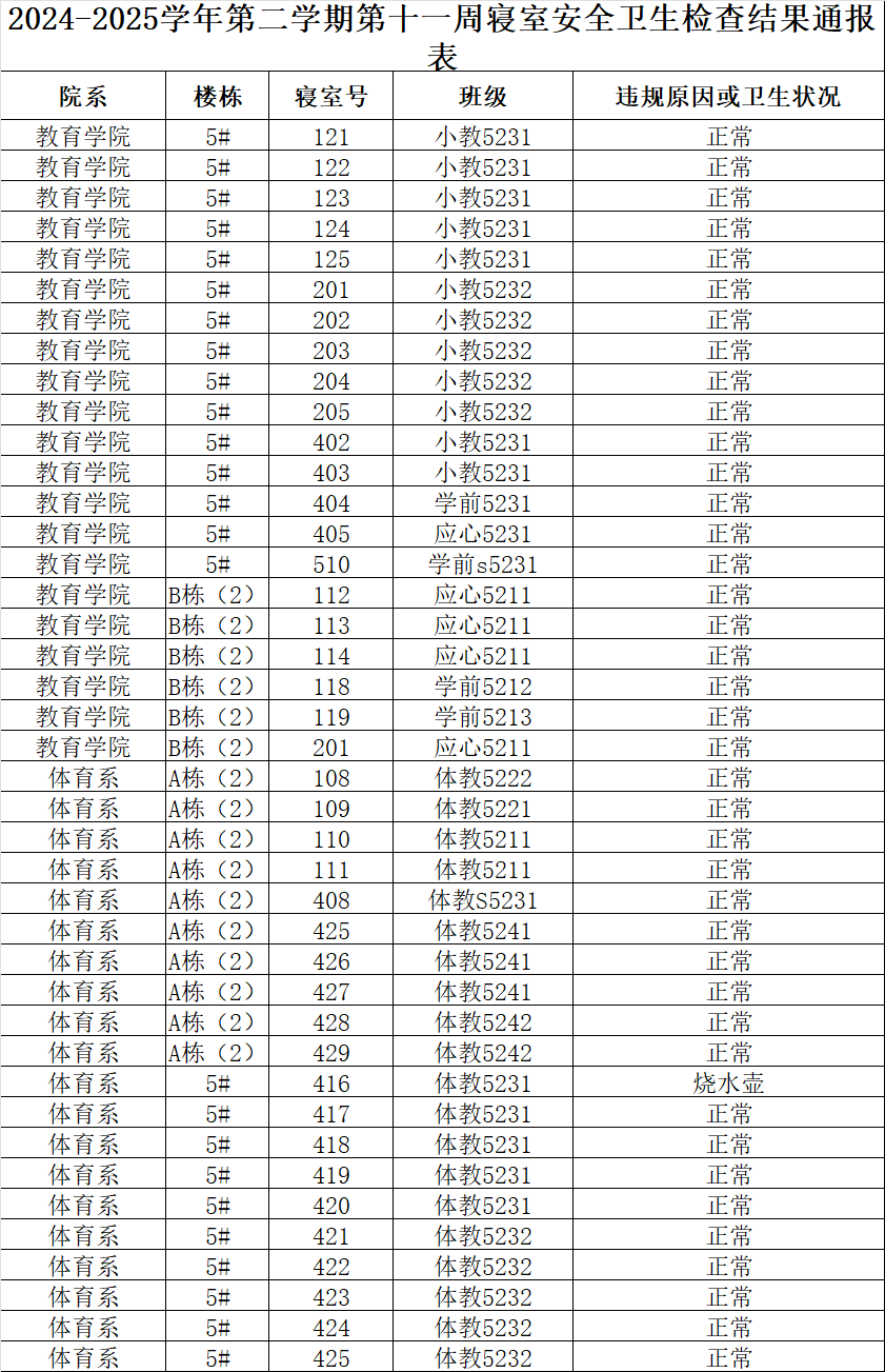 2024-2025学年第二学期第十一周寝室安全卫生检查结果通报表