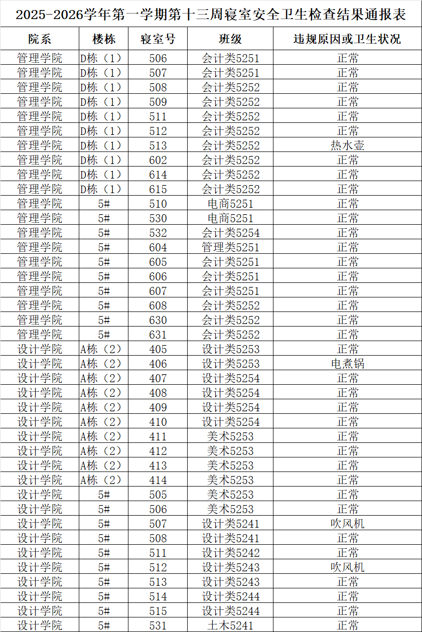 2025-2026学年第一学期第十三周寝室安全卫生检查结果通报表