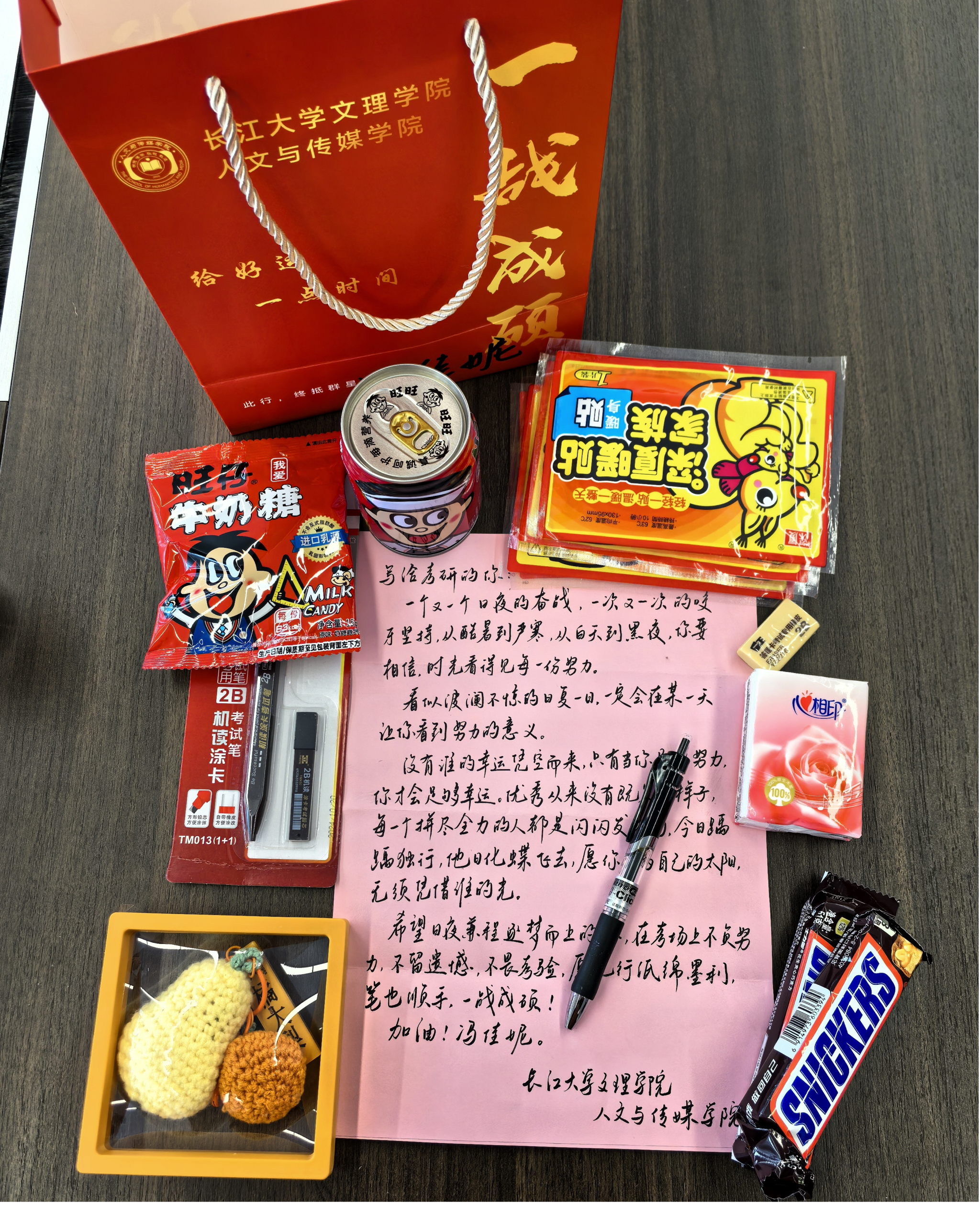 现场温馨洋溢,公司领导、老师为考研员工代表送上了精心策划、满载心意的“考研加油包”。每一份礼包都凝聚着公司的细致关怀:既有承载师长殷殷叮嘱的手写祝福信,为学子注入精神动力;也备齐了考试必备文具,提供坚实的物质支持。几片暖宝宝,恰似无声的陪伴,驱散严寒;一份份能量零食,寓意着续航与补给。而特别准备的“柿柿如意”挂件,更以谐音巧思,寄托着对学子前程似锦、心想事成的美好祝愿。每一件物品的挑选与组合,无不体现着公司在细节之处的温暖与用心。