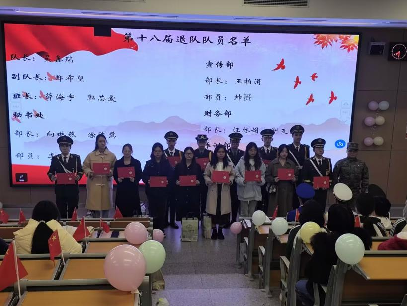 队长吴鑫瑞宣读第十八届退队人员名单,并为他们颁发聘书和纪念品。希望他们在以后的日子里心中有所向往,不惧道阻且长。国旗护卫队换届大会暨退队仪式落下帷幕,新老队员之间也完成了交接。一批老队员的离开,留下了他们的精神和担当。一批新队员的加入,传承了这份荣耀和责任。相信在一代一代国护人的接续努力下,国旗护卫队组织会越来越好!
