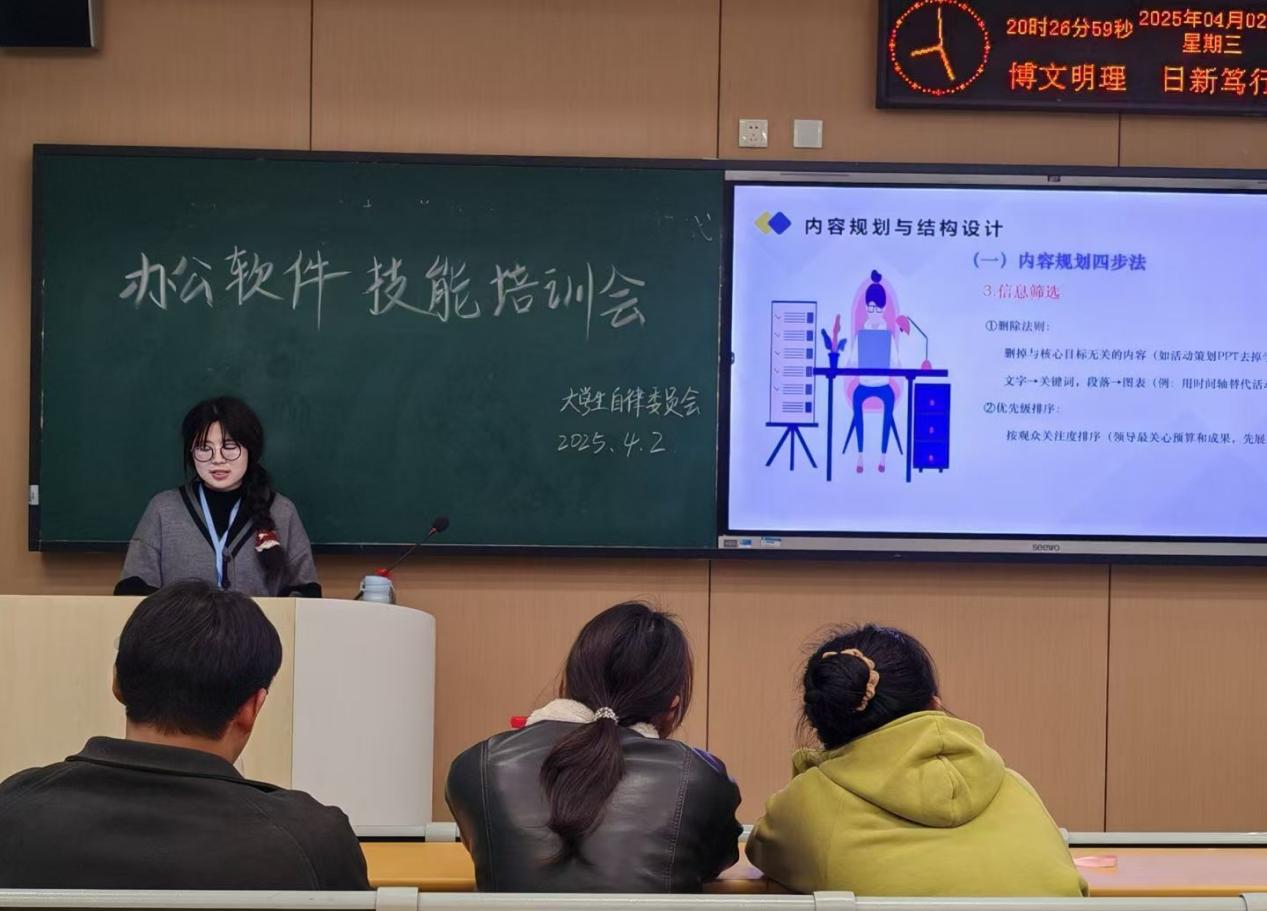 本网讯(通讯员:杨婷)老员工自律委员会于2025年4月2日在A-108教室成功举办“办公软件技能培训会”。本次会议聚焦办公软件的实用讲解与规范设计,老员工自律委员会全体成员参加本次会议。