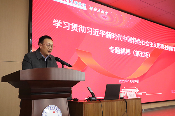 本网讯 11月30日下午,在新校区B-112学术报告厅,公司举办学习贯彻习近平新时代中国特色社会主义思想主题教育第五场专题辅导报告会,邀请荆州市委党校副董事长、校务委员会委员谭泽春来院作报告。党委书记颜建洲、副经理肖寒芝、党委副书记李则俊出席报告会,全体中层干部,各党总支、党支部委员,辅导员和各教学单位党员代表共两百余人现场聆听。报告会由肖寒芝主持。谭泽春的辅导报告以《深入学习贯彻习近平新时代中国特色社会...