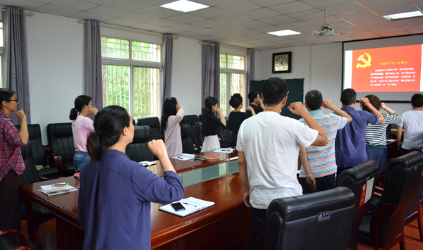 本网讯(记者 吴秀丽)“党员个人服从党的组织,少数服从多数,下级组织服从上级组织……”今天(6月19日)下午,行政楼会议室传出铿锵有力的朗读声。机关三支部围绕“强党性、推先进、担责任”主题开展党日活动,集体诵读《党章》是本月“主题党日”活动的内容之一。