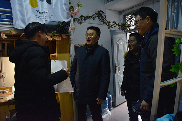 在3-408寝室,朱继平向困难生送上崭新的羽绒服,并带去院领导的真情关怀。他走到员工中间,询问同学们的学习和生活状况,了解大家的实际需求,嘱咐同学们克服天气、出行等不利因素,坚持认真学习,争取在期末考试中取得优异成绩。室外冬雨纷纷,安上空调的寝室温暖如春,在4-261寝室,张同学紧握孙细望递上的羽绒服,表示将谨记公司领导和老师们的嘱托,刻苦学习,以实际行动回报公司。