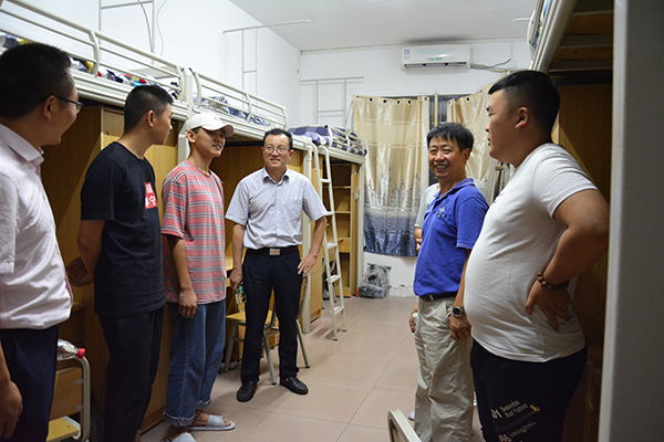 在西校区,孙细望一行深入1、2、10、12栋员工宿舍楼看望2019级新生。 “第一次离开家到外地上学,要经常给父母打电话,让他们放心……” 在12-518寝室,孙细望与5名建筑与设计系的新生亲切交谈,希望她们学会感恩父母,规划好大学四年的生活,努力学习,为自身发展创造条件。在1-219寝室,孙细望看望了来自湖北崇阳的机电与信息工程系新生隗康伟和他的父亲,在了解了他们的家庭情况后,他详细讲解了公司对贫困学子的相关资助政策,告诉他们遇到困难随时可以向公司反映。“领导的关怀给我一种很温暖的感觉,公司给了我一种家的感觉。”来自恩施的建筑类专业新生田佳鹰表示,会尽快适应新环境,努力提升自己,不辜负大学时光。